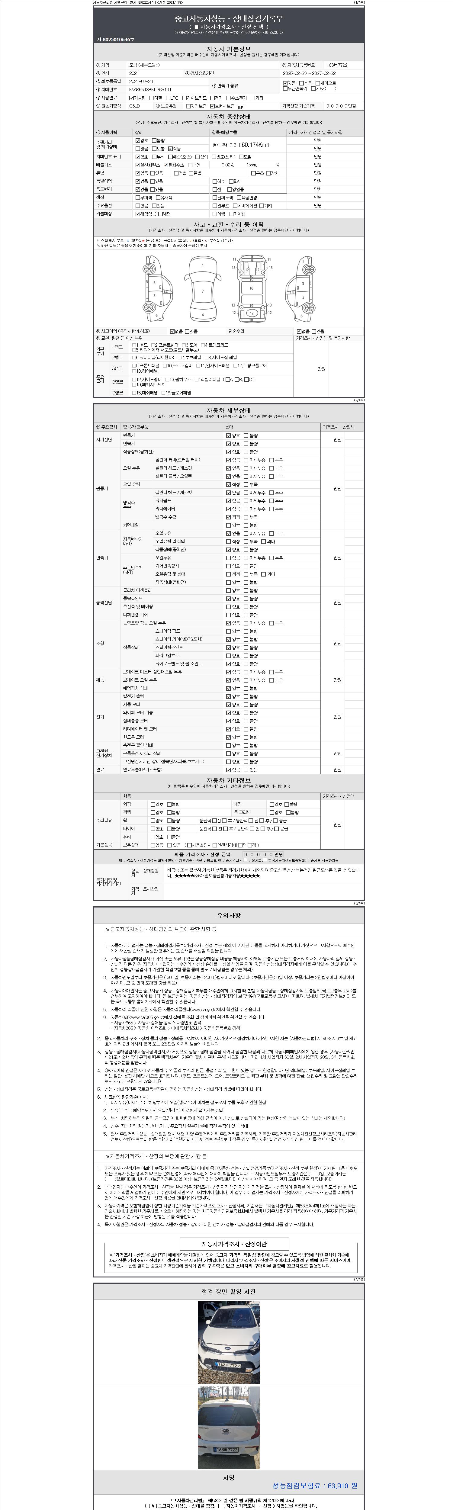 | 주행거리 | 60,174 km | 차량번호 | 163버7722 | 사고유무 | 성능기록부 참조 | 제시번호 | 제 2147483647 호 |
