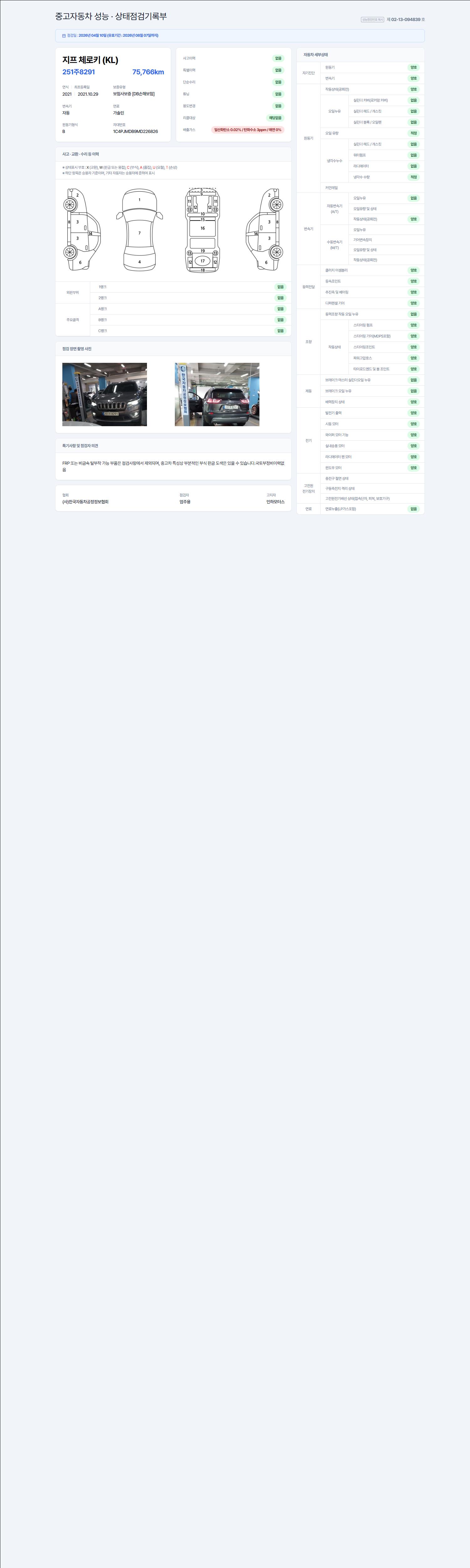 | 주행거리 | 75,748 km | 차량번호 | 251주8291 | 사고유무 | 성능기록부 참조 | 제시번호 | 제 2026066396 호 |