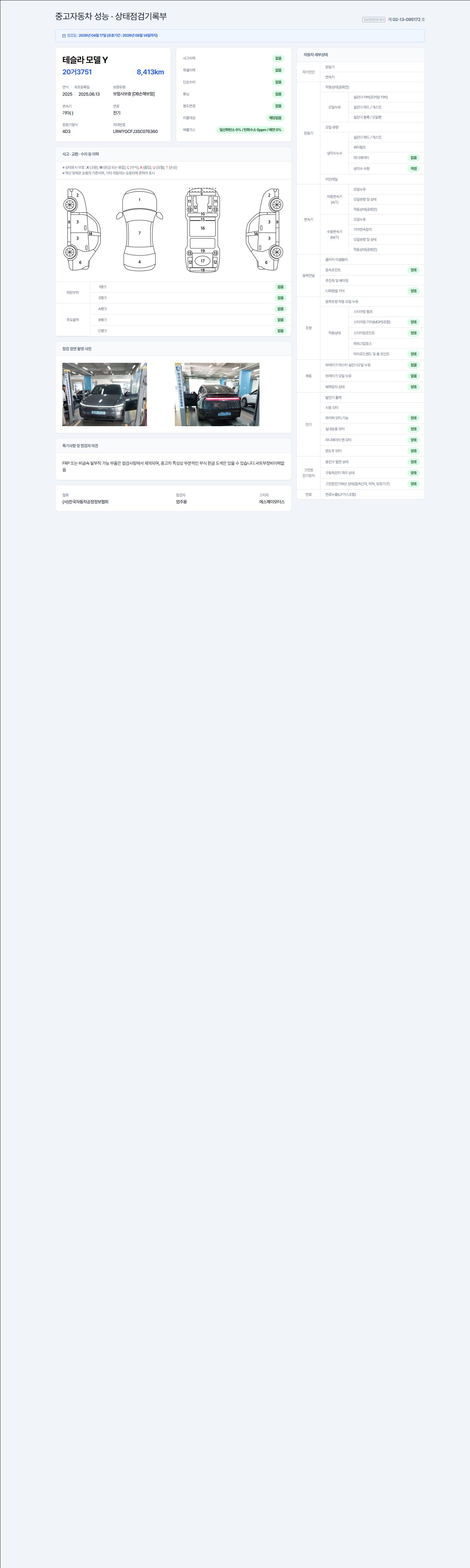 | 주행거리 | 8,413 km | 차량번호 | 20거3751 | 사고유무 | 성능기록부 참조 | 제시번호 | 제 2026071111 호 |