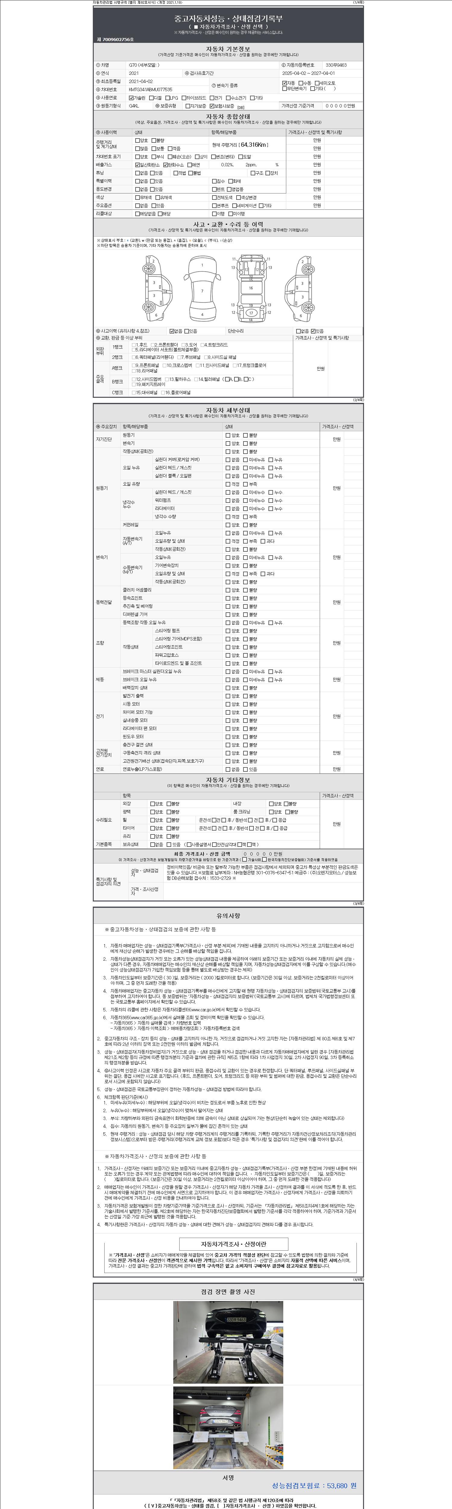 자동차관리법 시행규칙 제120조의 규정에 따라 별지 제 82호서식 《중고자동차 성능, 상태점검 기록부》를 발행한 성능, 상태점검자 및 매매자는 아래의 보증기간 또는 보증거리 이내의 중고자동차, 성능점검 기록부에 기재된 내용과 자동차의 실제 성능, 상태가 다른 경우 계약 또는 관계법령에 따라 매수인에 대하여 책임을 집니다.