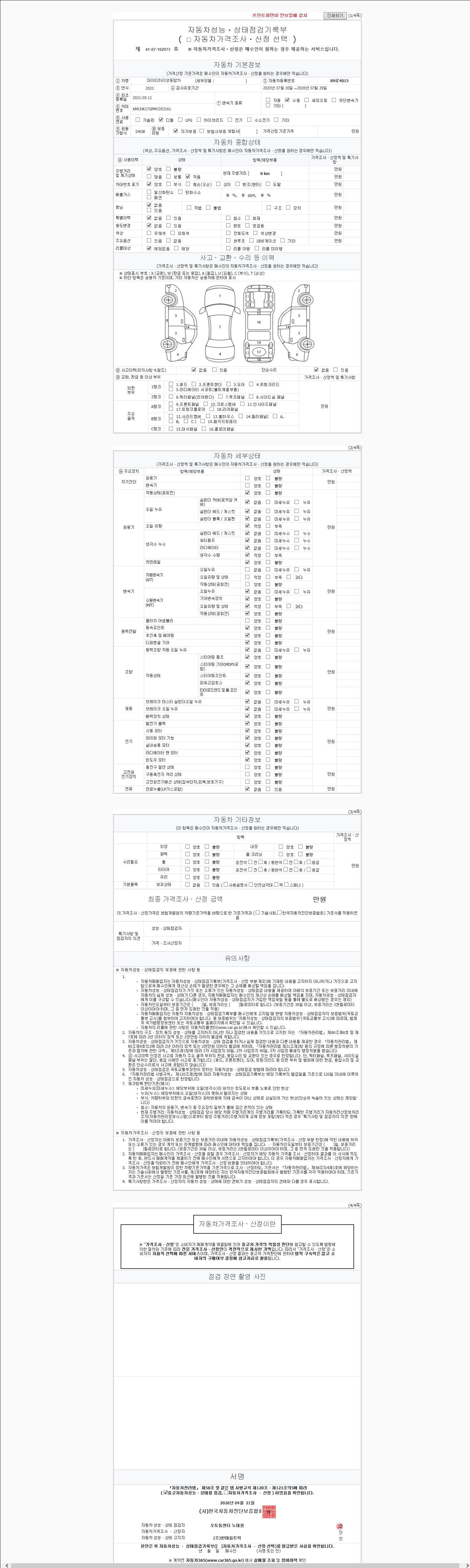 -중고자동차 매매업자를 통해 차량을 구입하실 경우 반드시 "중고자동차 성능, 상태점검 기록부"를 교뷰 받으셔야 하며, 매매업자는 반드시 의무 교부 하여야 압니다.